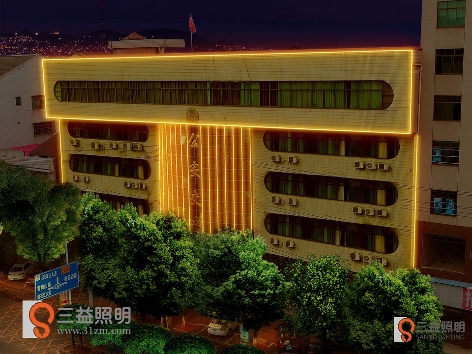 桃江縣公安交警大隊、事故入處理中心外墻燈光設(shè)計方案,采用線條燈勾勒大樓輪廓。